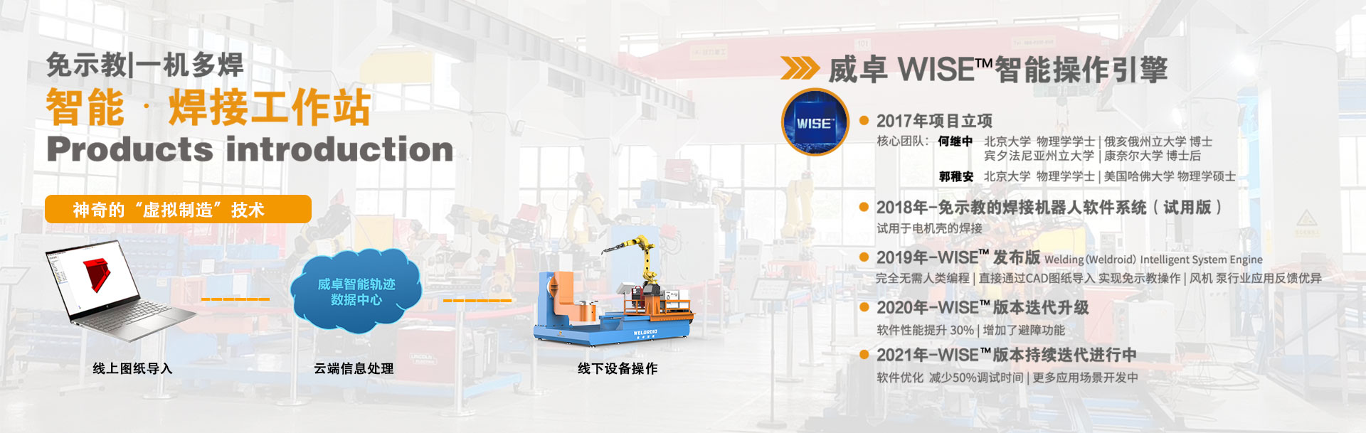 無錫威卓智能機器人有限公司成立于2017年,是無錫市政府引進的科技領軍型高新技術企業(yè),公司研發(fā)團隊80余人,我們堅持自主創(chuàng)新,利用自主開發(fā)的虛擬制造技術對傳統(tǒng)焊接行業(yè)進行升級改造。 公司主推的工業(yè)風機系列-智能焊接工作站產(chǎn)品,具有免示教、實時跟蹤、簡易工裝、傻瓜式操作等優(yōu)點,真正幫助企業(yè)解決了招焊工難,用工成本高,焊接質量不穩(wěn)定等問題。